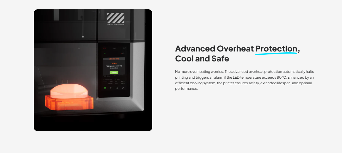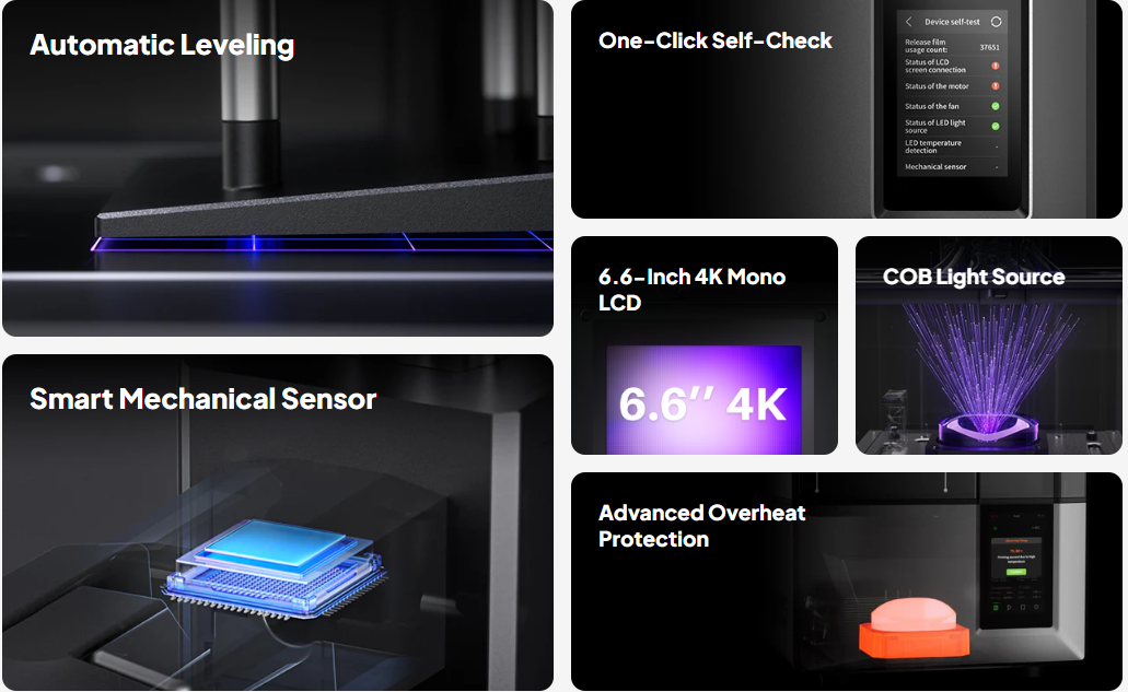 A4: It has overheat protection (pauses when LED > 80 °C), a mechanical resin-level sensor, and a resin residue detector to prevent screen damage.