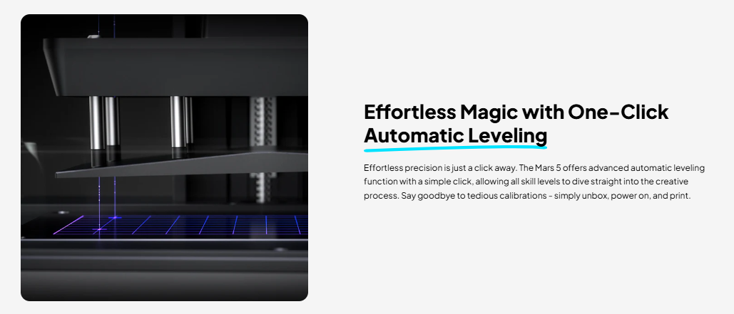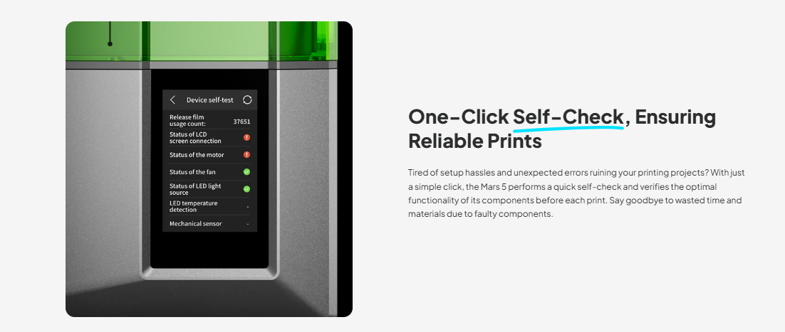 Elegoo recognizes that not every user wants to manually calibrate their printer before each job. That’s why the Mars 5 includes a One-Click Self-Check function: with a single tap, the printer runs a self-diagnosis to ensure everything is prepared—Z-axis, build plate, sensor status—and is ready to print. Coupled with automatic bed leveling, this feature dramatically reduces setup time and improves print reliability.
