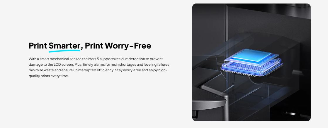 The Mars 5 is equipped with a smart mechanical sensor that monitors both resin level and residue. If the resin runs low, or if there’s leftover resin residue that could harm the LCD screen, the sensor triggers an alarm to safeguard against print failures or screen damage. This minimizes material waste and enhances the longevity of critical components.