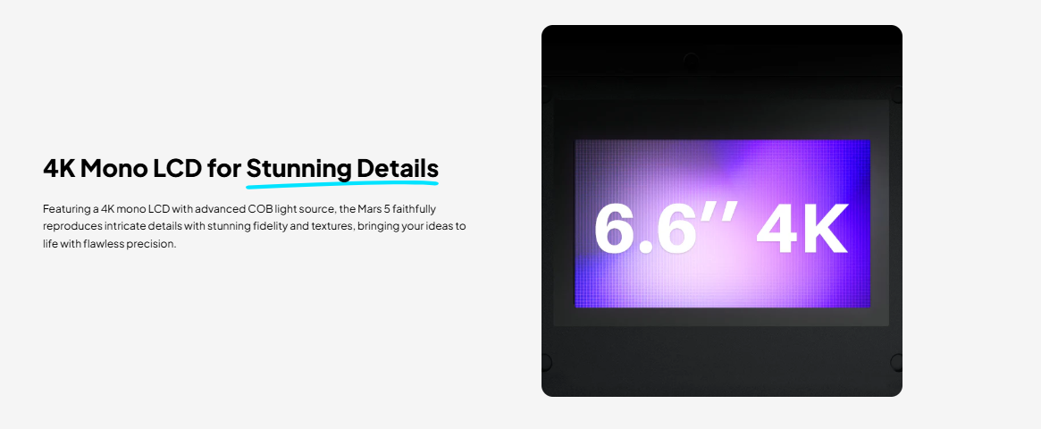 At the core of the Mars 5’s impressive performance is its 6.6-inch 4K monochrome LCD panel, backed by a powerful COB (Chip-On-Board) light source with 405 nm wavelength. This configuration ensures uniform light distribution and high fidelity in curing, delivering an XY resolution of 35 × 35 µm (4098 × 2560 pixels). The fine resolution allows ultra-detailed prints with crisp edges and smooth surfaces, making intricate designs or small-scale models come to life with exceptional clarity.