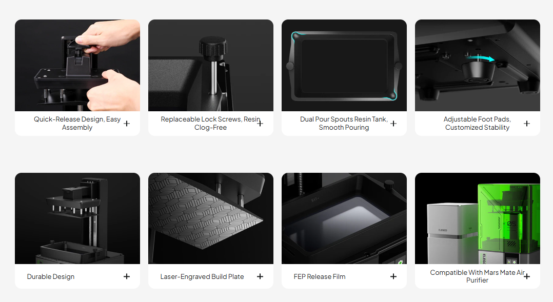 A10: The Mars 5 is compatible with the Elegoo Mars Mate air purifier (activated carbon filter) to help reduce resin fumes.