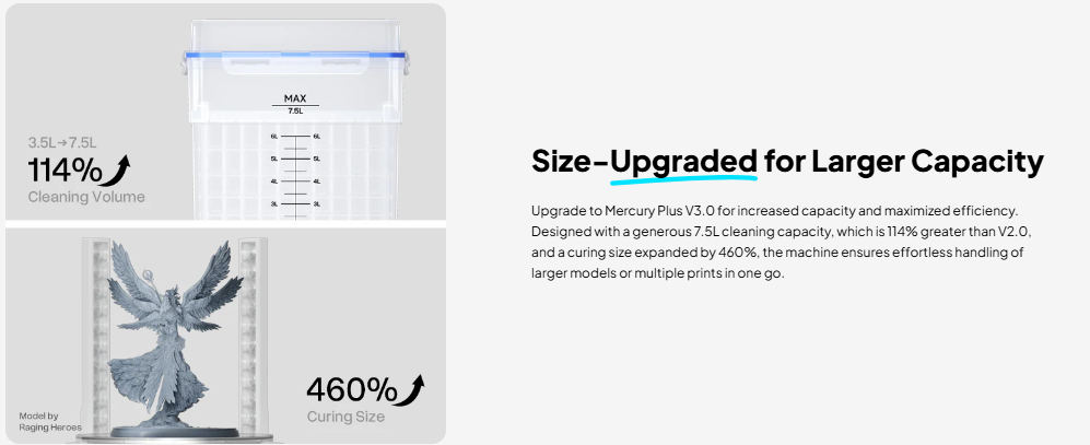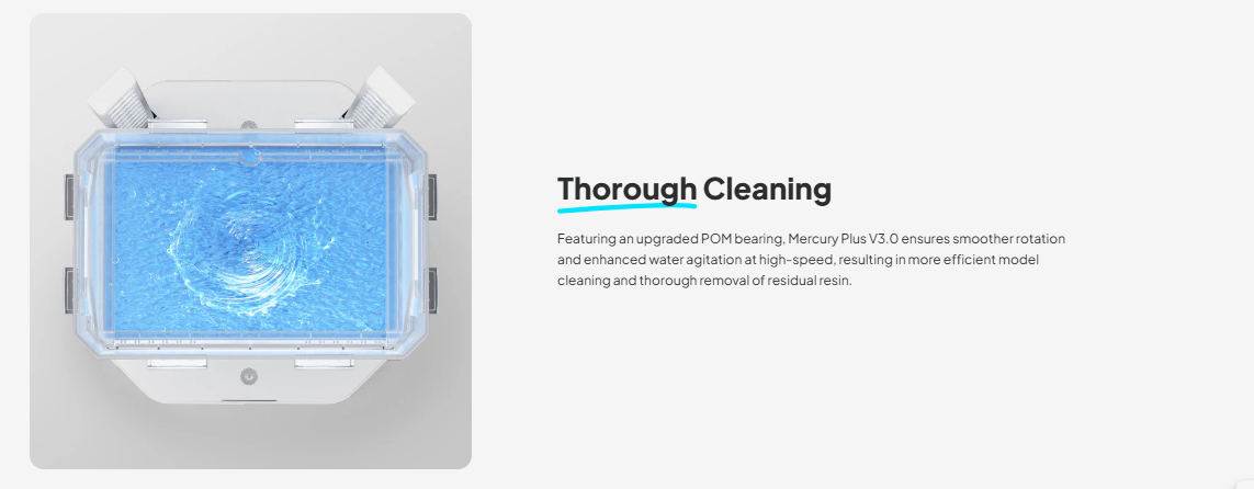 With two major phases required after resin printing — washing and curing — the Mercury Plus V3.0 combines both into a single compact machine. The washing function removes excess uncured resin using IPA or water (depending on your resin type), while the curing function solidifies the model evenly for maximum strength and detail preservation.