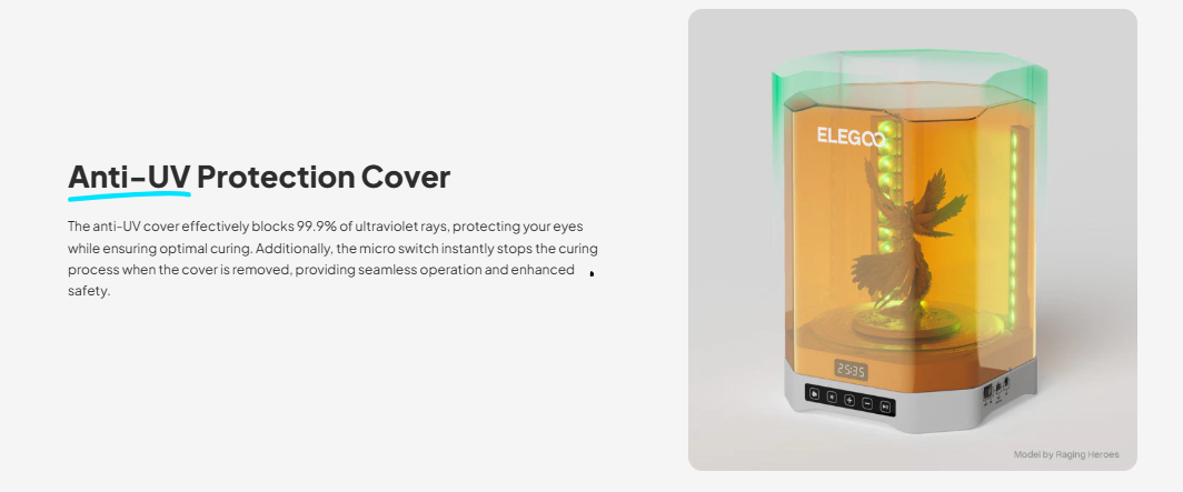 Safety has always been a top priority in Elegoo’s post-processing machines. The Mercury Plus V3.0 includes an upgraded UV-blocking transparent cover that filters out 99.9% of harmful UV light, protecting your eyes and skin. The machine automatically pauses curing when the cover is lifted, ensuring added safety during operation.