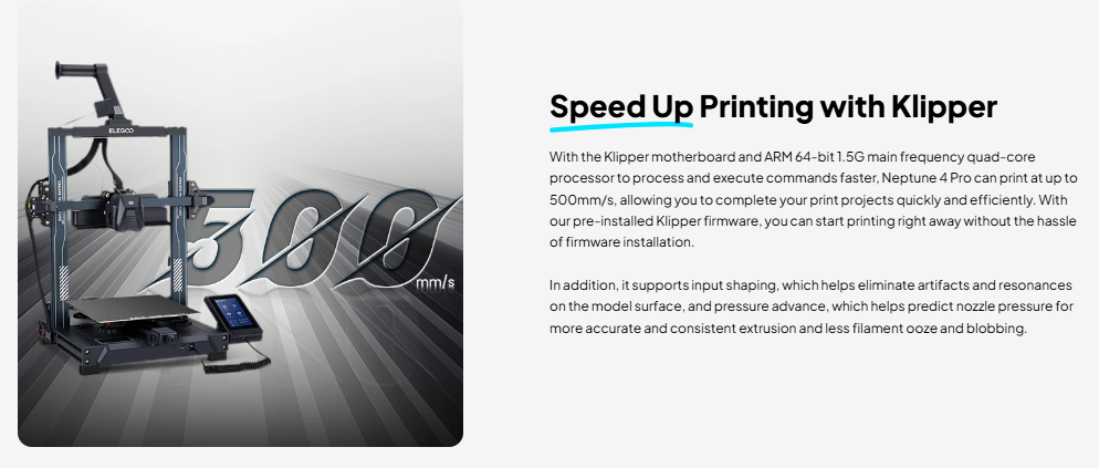 The Elegoo Neptune 4 Pro is engineered to deliver both speed and precision, making it one of the most exciting consumer FDM printers available today. Thanks to its pre-installed Klipper firmware and a powerful ARM 64-bit, quad-core 1.5 GHz processor, the Neptune 4 Pro can achieve a top speed of 500 mm/s, while also supporting advanced motion features like input shaping and pressure advance for smooth, accurate prints.