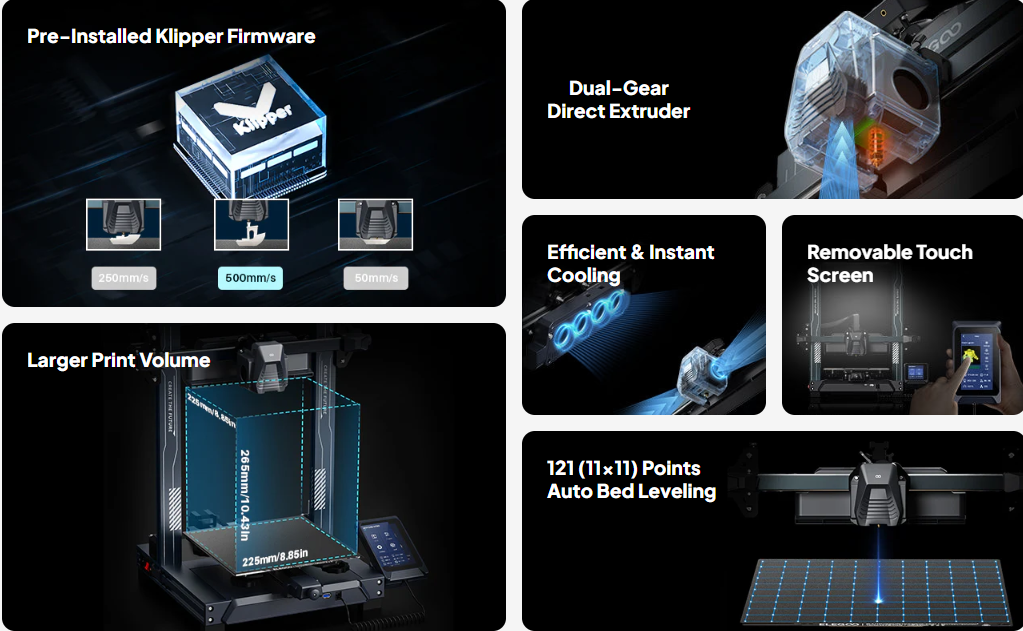 - ⚡ Incredible Speed: Up to 500 mm/s thanks to Klipper on a quad-core board.