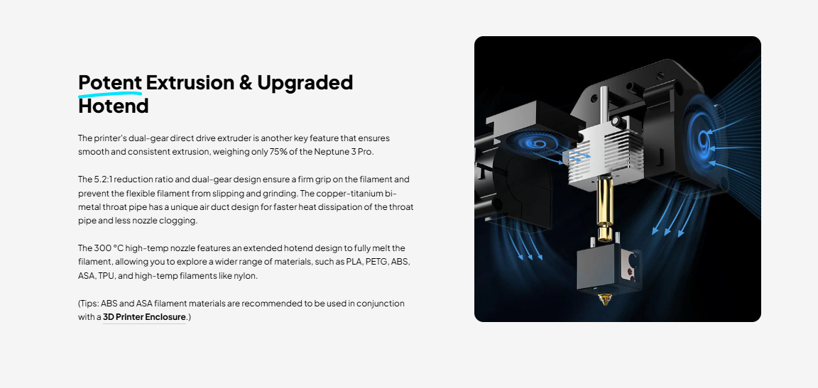 The extrusion system is robust and precise: a dual-gear direct-drive extruder with a 5.2:1 reduction ratio ensures strong filament grip and reliable feeding, even at high speeds or with flexible materials. The hotend supports up to 300 °C, opening up printing possibilities for materials like PLA, PETG, ABS, TPU and even Nylon.