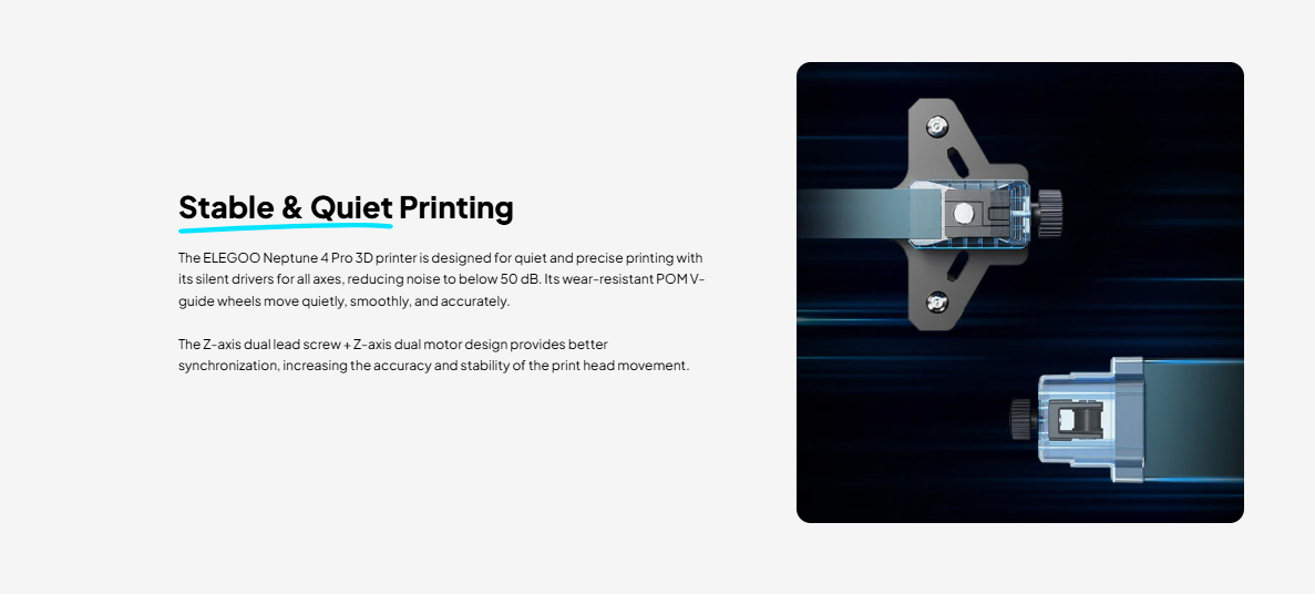 Stability and precision are boosted by a dual Z-axis motor setup with synchronized lead screws, ensuring better motion control and layer alignment. The printer also includes silent stepper drivers, reducing operational noise to below 50 dB, making it suitable for shared workspaces or quiet environments.