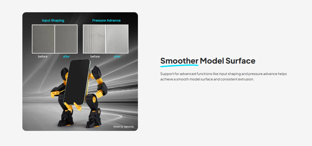 - 🧠 Advanced Motion Control: Input shaping & pressure advance for high-quality, fast prints.