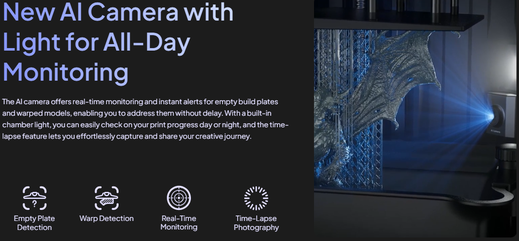 - AI Camera – Layer monitoring, anti-failure detection, and timelapse support