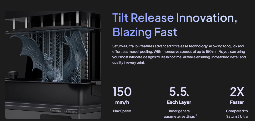 The Saturn 4 Ultra is engineered for speed. Its intelligent release system, durable Z-axis, and optimized light engine allow for staggering print speeds of up to 150 mm/h, significantly reducing turnaround time. This makes it suitable for production environments, service bureaus, and rapid prototyping.