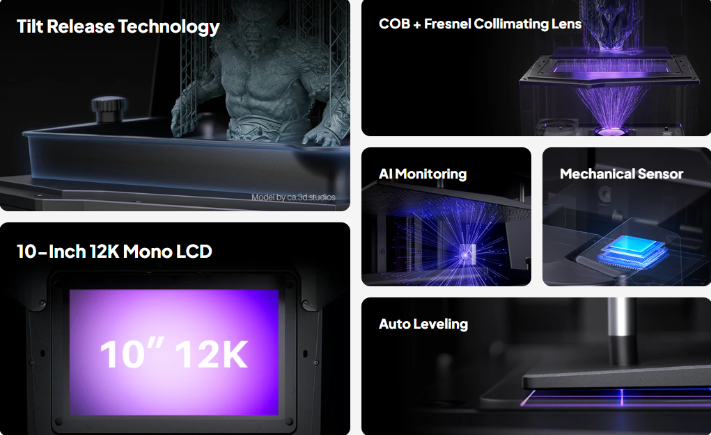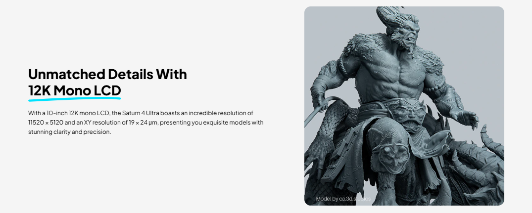 At the heart of the Saturn 4 Ultra is its 10-inch 12K mono LCD, capable of producing exceptionally sharp, detailed prints with a resolution that captures even the smallest texture and surface nuance. Whether you’re printing intricate miniatures, dental models, jewelry prototypes, mechanical parts, or artistic sculptures, the Ultra ensures outstanding clarity and dimensional accuracy. Its upgraded COB + Fresnel lens collimated light source provides uniform and consistent light distribution across the entire build plate, eliminating exposure inconsistencies and boosting print success rates.